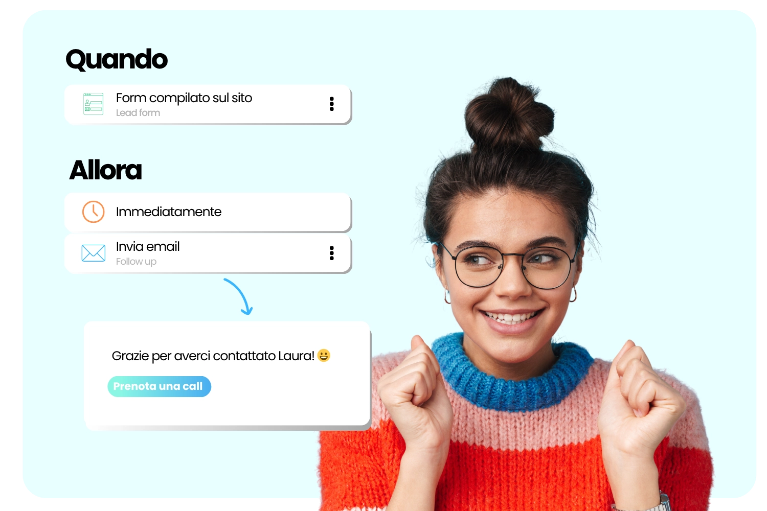 Automatizza follow-up, lead scoring, reminder, routing automatico, ticket di assistenza o contenuti personalizzati.