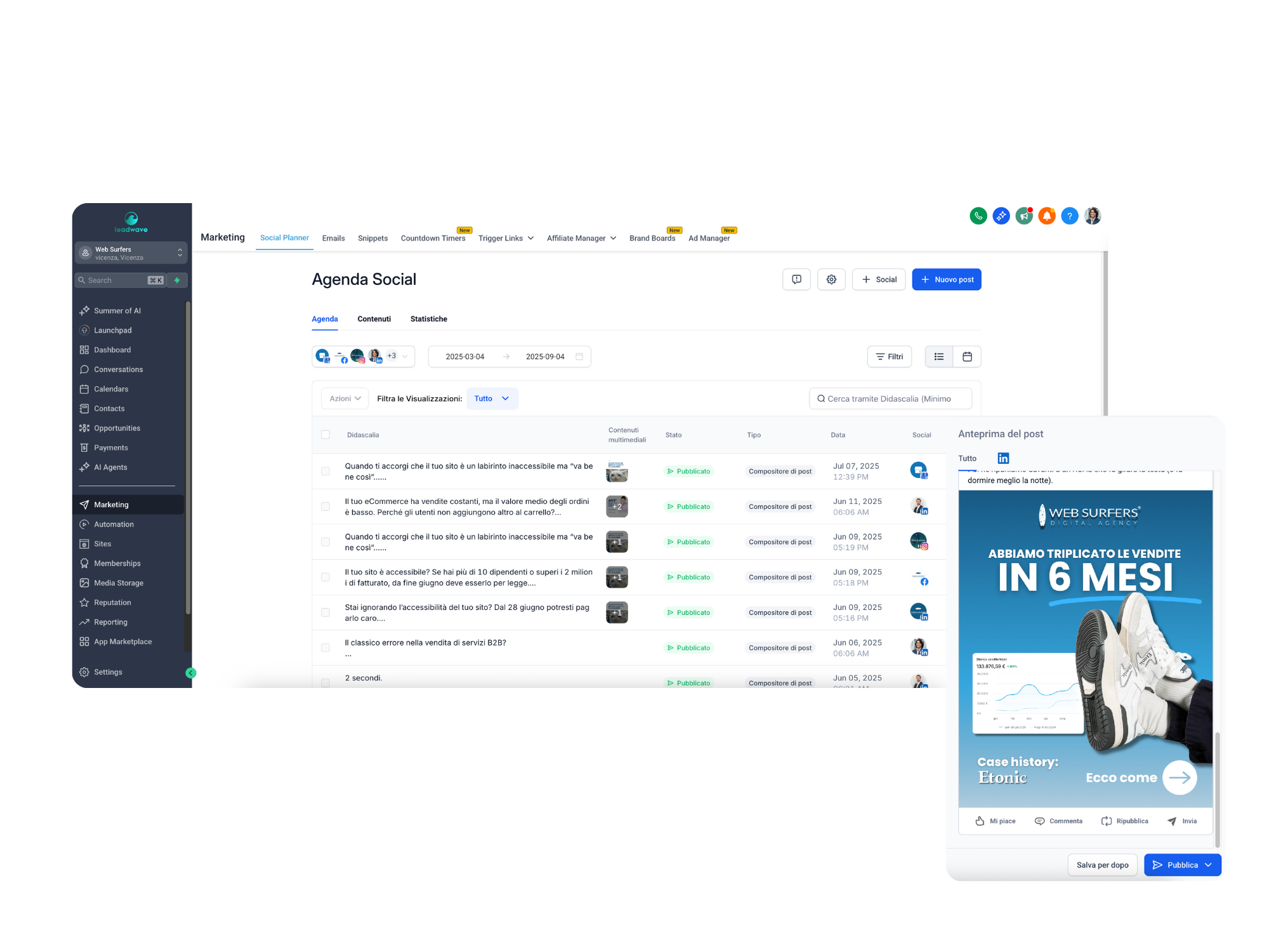 Puoi integrare campagne e automatizzare post per promuovere eventi, offerte o contenuti blog.