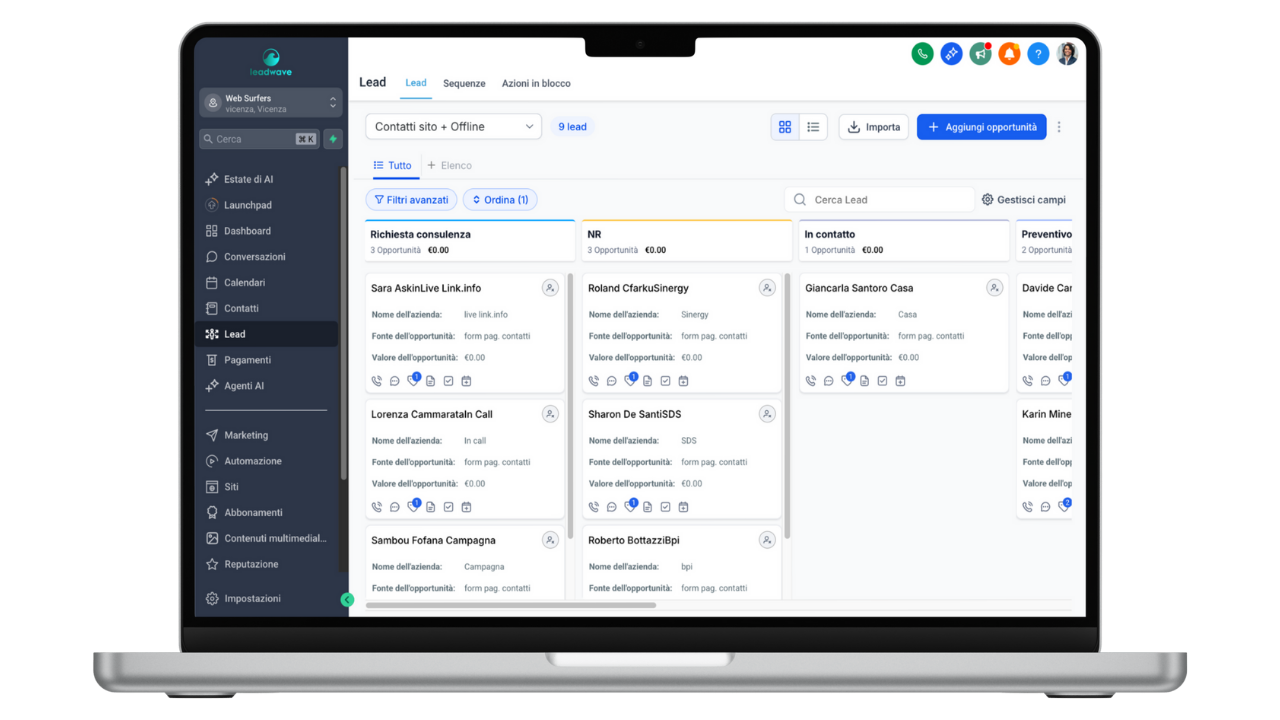 Leadwave centralizza tutti i contatti in un unico CRM: niente più lead dimenticati o disorganizzati, ogni interazione è registrata e pronta per il follow-up automatico.