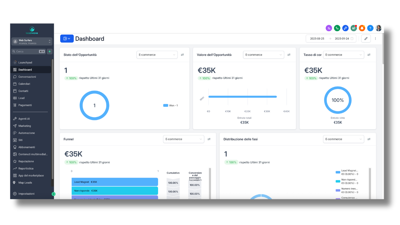 "Leadwave ha trasformato il nostro servizio clienti: risposte immediate, bot intelligenti per FAQ e un’organizzazione impeccabile dei ticket—il tutto con la stessa piattaforma che già usiamo per vendite e marketing." – Sara M., Responsabile Customer Care