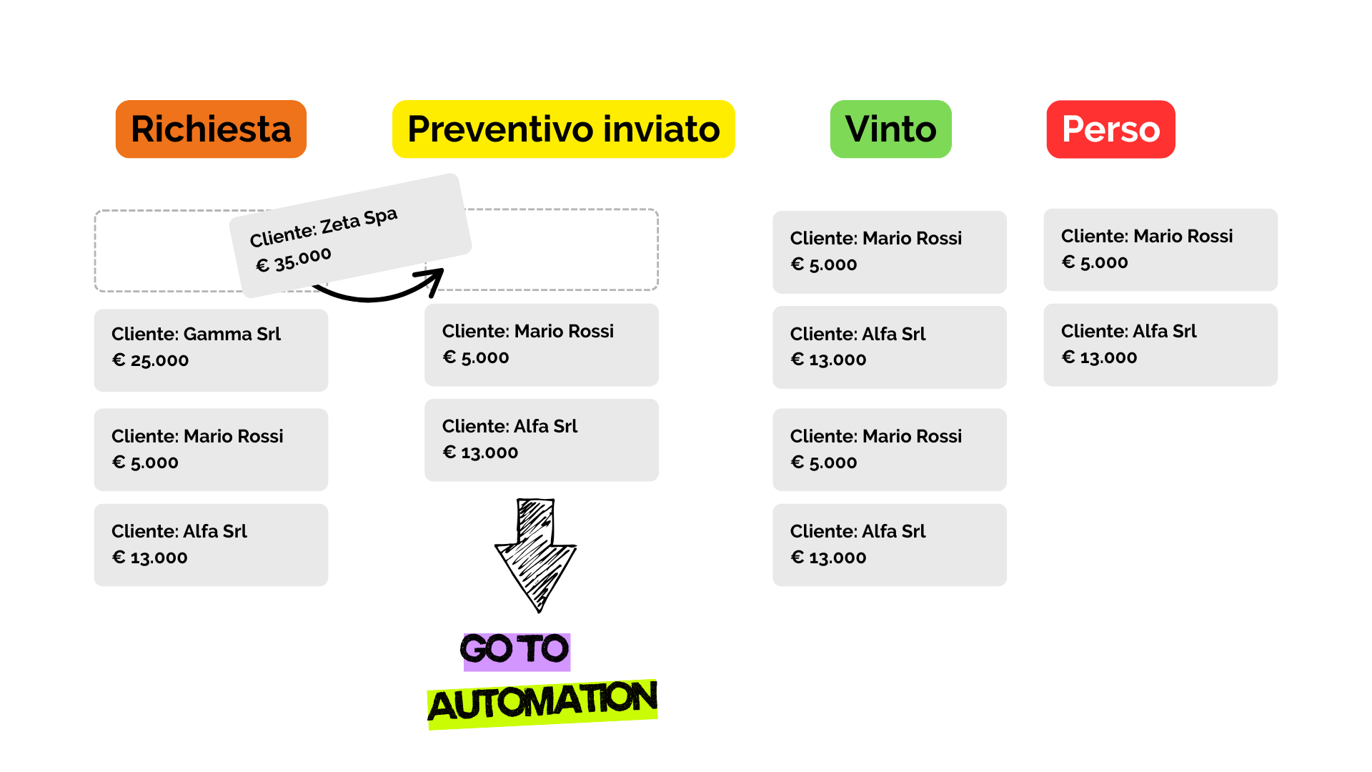 Trascina e posiziona le trattative aperte, e vedi chiaramente valore e volume in ogni fase.